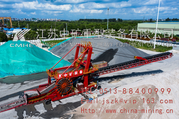 該設(shè)備包括行走機(jī)構(gòu);鏈板進(jìn)料裝置;帶式輸送機(jī)系統(tǒng);臂架俯仰機(jī)構(gòu);臂架旋轉(zhuǎn)機(jī)構(gòu);卡車爬坡裝置;液壓系統(tǒng);控制系統(tǒng);配電系統(tǒng)(移動(dòng)式電站)等。全部系統(tǒng)可以在堆場(chǎng)場(chǎng)地內(nèi)移動(dòng),行走機(jī)構(gòu)的行走輪采用重載汽車實(shí)心輪胎,無(wú)須在堆場(chǎng)內(nèi)布置固定軌道,增加堆場(chǎng)利用率;進(jìn)料裝置與輸送懸臂集為一體,二者均安裝于一個(gè)公共底盤之上,構(gòu)成一體式移動(dòng)堆高機(jī);臂架俯仰機(jī)構(gòu)采用鋼絲繩俯仰形式,臂架旋轉(zhuǎn)機(jī)構(gòu)采用回轉(zhuǎn)減速電機(jī)和回轉(zhuǎn)軸承,配電系統(tǒng)采用發(fā)電機(jī)組和電纜卷筒供電,整個(gè)系統(tǒng)具有完整地獨(dú)立性。