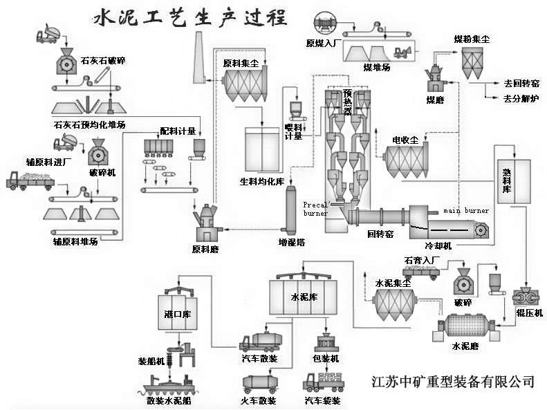 硅酸鹽類水泥生產工藝在水泥生產設備中具有代表性,是以石灰石和粘土為主要原料,經破碎、配料、磨細制成生料,然后喂入水泥窯中煅燒成熟料,再將熟料加適量石膏(有時還摻加混合材料或外加劑)磨細而成。