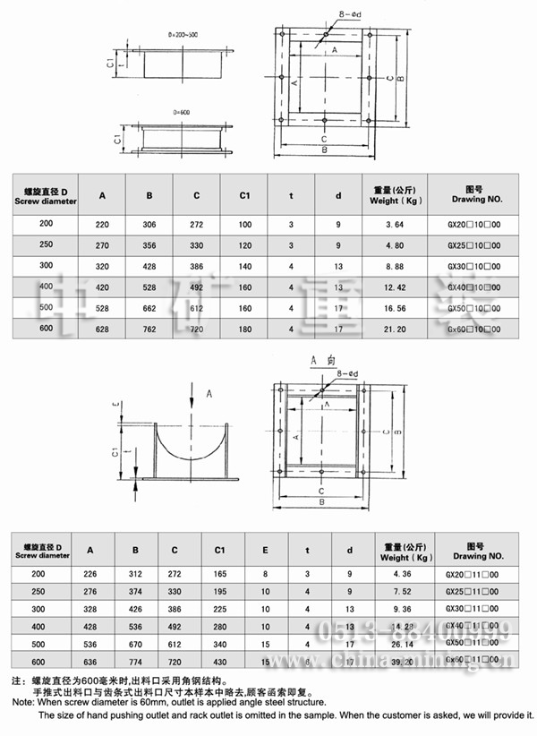 GX螺旋機的出料口有方形出料口、手推式出料口和齒條式出料口三種。后兩種出料口拉板的 開閉方向,隨安裝不同而分右裝、左裝兩種: