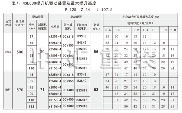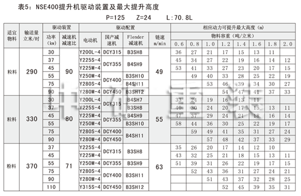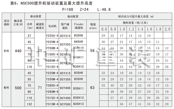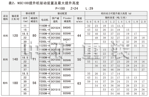 NSE系列高速板鏈斗式提升機(jī)共有九種基本型號:NSE100、NSE200、NSE300、NSE400、NSE500、NSE600、NSE700、NSE800、NSE1000,每種型號根據(jù)輸送物料的不同,選擇不同的提升速度,提升速度≤70m/min,提升高度65m。另外,中礦公司還可根據(jù)用戶要求輸送量介于上述型號之間的擴(kuò)展型號。